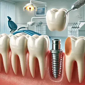 - Имплантация: установка искусственного корня с коронкой, замещающей утраченный зуб.